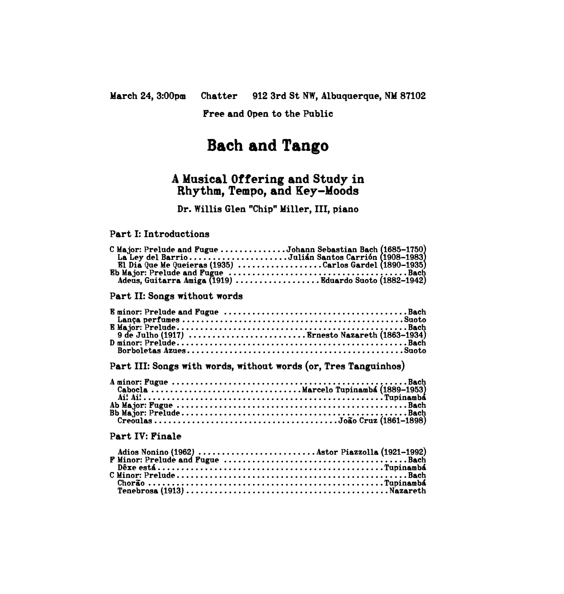 Dr. Miller's conservatory-based training has included the teachers Nelita True, Horacio Gutiérrez, Charles Asche, Benjamin Yu, Ruth Tomfohrde, Wesley Ball, Tayloe Harding, and Landon Bilyeu, and masterclass training with Andre Watts. Full biography at Bach Cantatas website, connect on LinkedIn. Dr. Miller is a active member of the Piano Technician Guild, Music Teacher National Association and the Albuquerque Music Teacher Association.